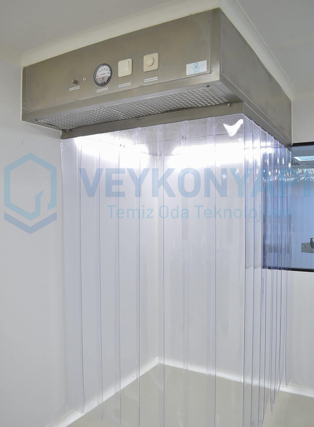 consisting of fan filter units, transparent curtains, and a speed control system with a